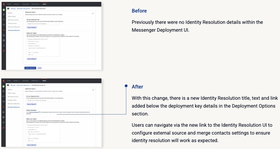 - 메신저 배포 UI 개선 사항: 새로운 신원 확인 섹션이 추가되었습니다 배포 옵션 . 이 섹션에는 사용자가 구성할 수 있는 Identity Resolution UI에 대한 영구 링크가 포함되어 있습니다. 외부 소스 그리고 연락처 병합 설정.