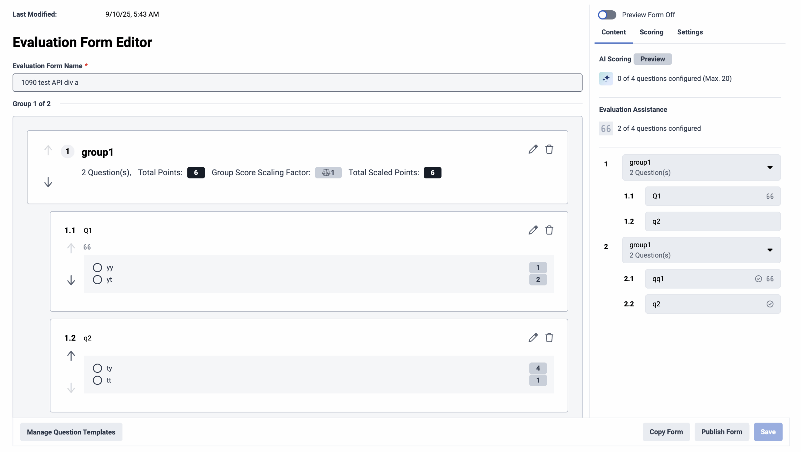 - 평가 양식의 이름을 클릭합니다. 저장된 평가 양식 또는 가장 최근에 게시된 평가 양식의 사본이 편집기에서 열립니다. 양식에는 마지막 개정 날짜와 시간이 포함됩니다. 이 정보는 양식 버전 ID를 나타냅니다.