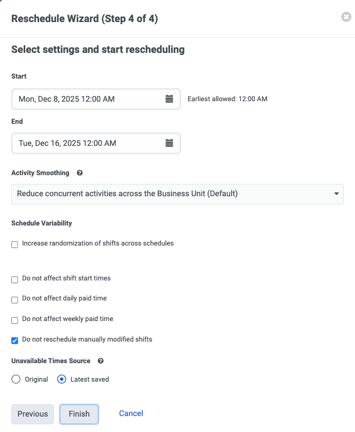 7. 그만큼 일정 변경 마법사(4/4단계) 화면 표시됩니다 . 설정 선택 및 일정 변경 시작 섹션에서 다음 작업 중 하나를 수행합니다.