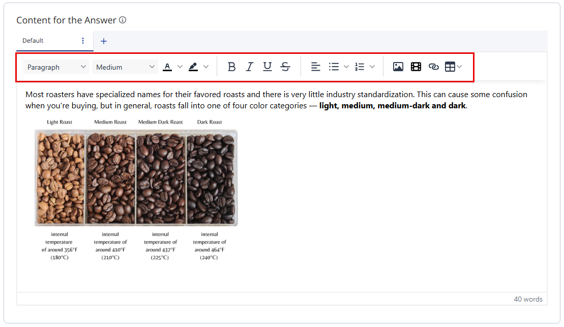 이 섹션에서는 지식 답변의 텍스트 형식을 지정하는 방법과 이미지 또는 비디오 콘텐츠를 추가하는 방법에 대해 설명합니다.