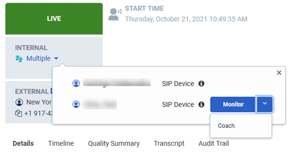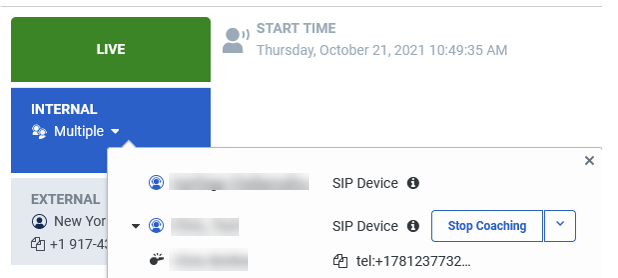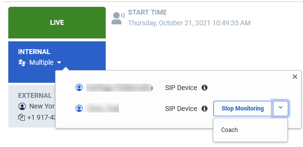 동일한 상호작용에서 모니터링과 코칭을 전환할 수 있습니다. 예를 들어 통화를 모니터링한 다음 코치로 전환하여 어려운 상황에서 상담원에게 이야기할 수 있습니다. 전환하려면 먼저 이름 옆에 있는 목록에서 적절한 옵션을 선택하여 현재 활동(모니터링 또는 코칭)을 중지한 다음 대체 활동을 선택합니다. 원하는 만큼 Monitor와 Coach 모드를 전환할 수 있습니다. 이미지를 클릭하면 확대됩니다.