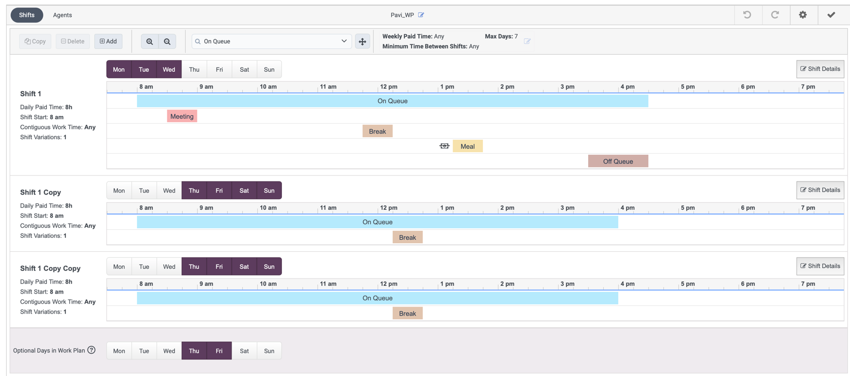 스케줄링 엔진은 선택적인 요일을 선택하지 않는 한 선택된 일일 교대조가 두 개 이상 포함된 요일에 대해 정확히 하나의 일일 교대조를 선택합니다. 이 경우 스케줄링 엔진은 일일 교대를 선택할 수 있습니다. 아래에 근무 계획의 선택적 일수, 일정 엔진에서 요일 또는 요일을 클릭하여 해당 날짜의 일일 교대조를 선택하도록 지시합니다. 선택 과목 열.