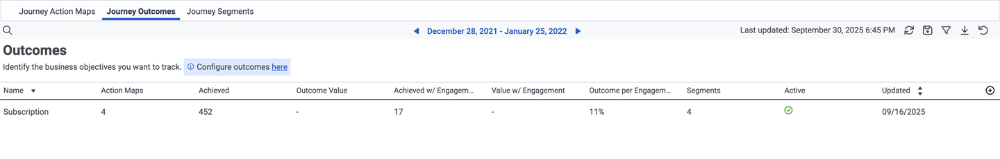 여정 결과 보고서는 결과의 성과를 제공합니다. 결과의 성과(참여 여부에 관계없이)에 대한 정보와 이에 영향을 미치는 작업 맵 및 세그먼트를 사용하여 비즈니스 요구 사항에 맞게 결과를 구성할 수 있습니다.