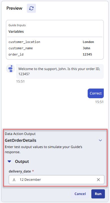 - 각 변수에 값을 할당하고 클릭하세요. 달리다 . 위젯은 변수 값을 아래에 표시합니다. 가이드 입력 채팅 시뮬레이션을 시작합니다.