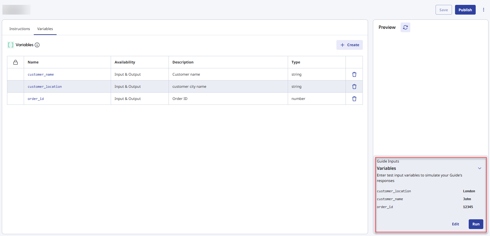 - 가이드에 변수를 정의한 경우 미리보기 위젯에서 변수에 값을 할당하라는 메시지가 표시됩니다. 값을 할당하려면 다음 단계를 수행하세요.