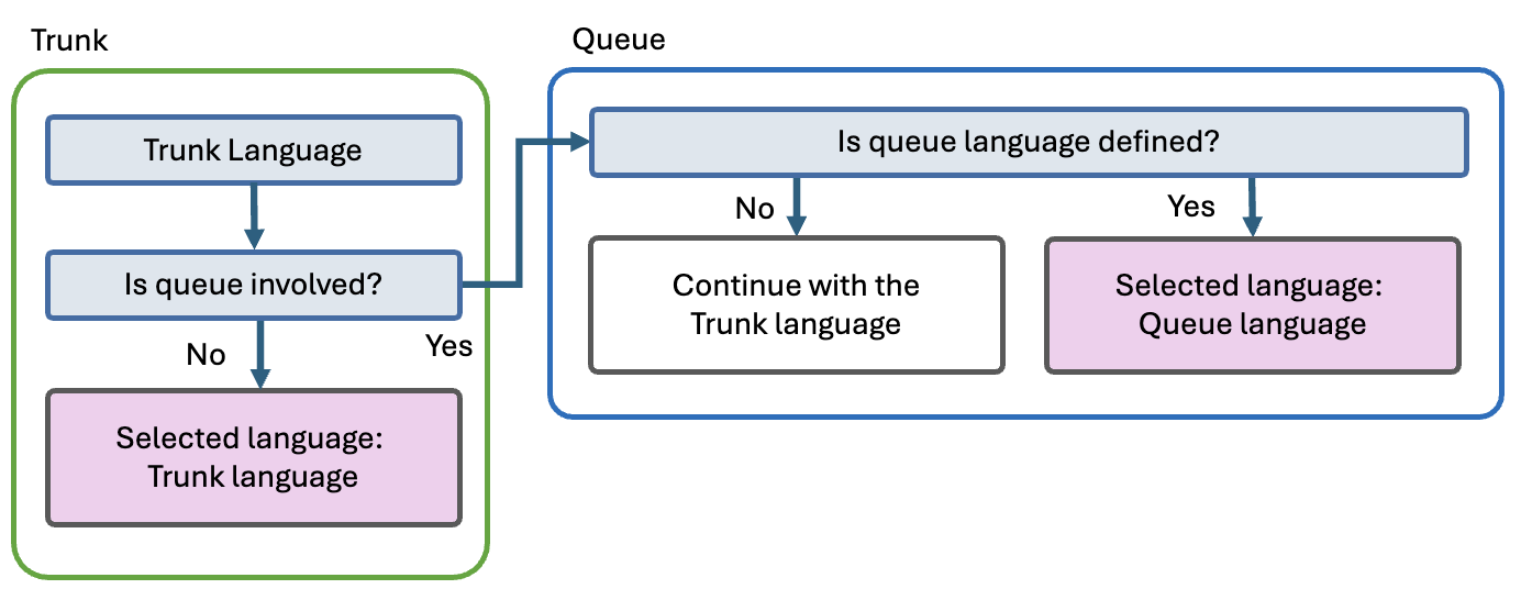 상담원은 언제든지 전화에 응답할 수 있으며, 이로 인해 3단계나 4단계에서 프로세스가 중단될 가능성이 있습니다. 이런 경우, 최종 언어 값은 상담원이 통화에 응답하는 순간 활성화된 언어 값입니다. 향후 개선을 통해 상담원이 대기열에 즉시 대기할 수 있는 경우에도 이 논리가 일관되게 유지되도록 하는 안전 장치가 도입될 것입니다.