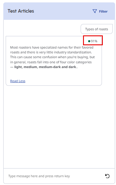 검색 결과는 항상 지식 기반에서 할당한 신뢰 번호를 기준으로 정렬됩니다. 지식 기반에서 할당한 신뢰 번호는 채팅 응답 바로 위에 표시됩니다. 그러나 신뢰도가 가장 높은 기사는 고객이 원하는 답변이 아닐 수 있습니다. 질문과 답변 쿼리를 테스트하고 수정하면 상담원과 고객에 대한 검색 결과가 향상됩니다.