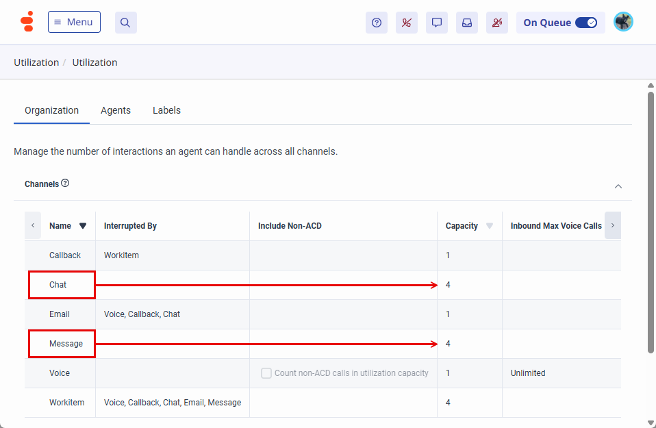 웹 채팅에서 웹 메시징으로 마이그레이션하면 에이전트가 다양한 유형의 상호 작용에 응답합니다. 두 채널 모두에 대해 Genesys Cloud는 관리자에게 조직 수준 또는 에이전트 수준에서 에이전트 활용도를 정의할 수 있는 옵션을 제공합니다. 이러한 옵션은 에이전트가 미디어 유형별로 처리하는 상호 작용 수를 결정합니다.