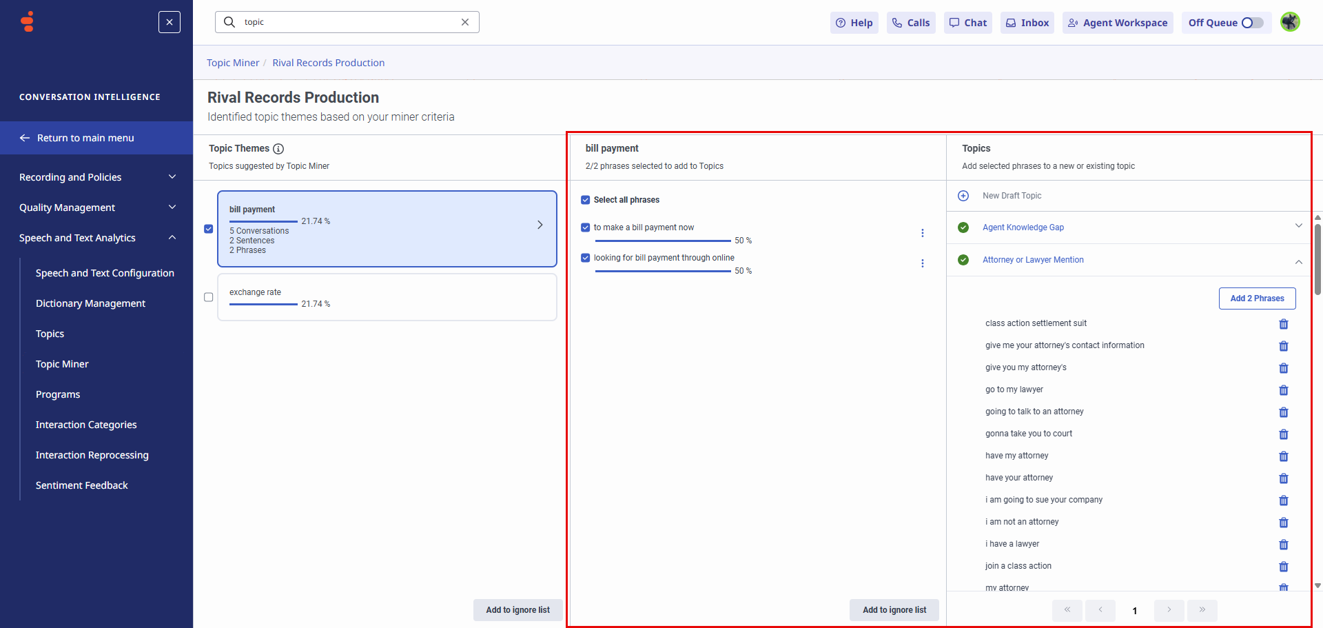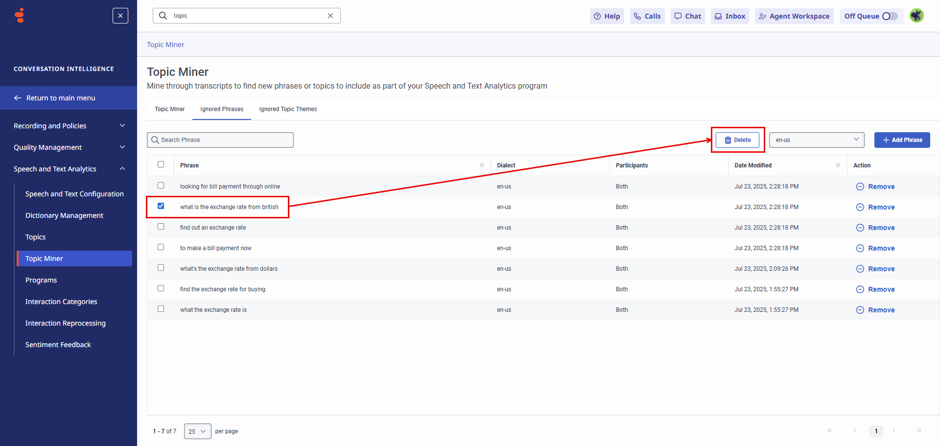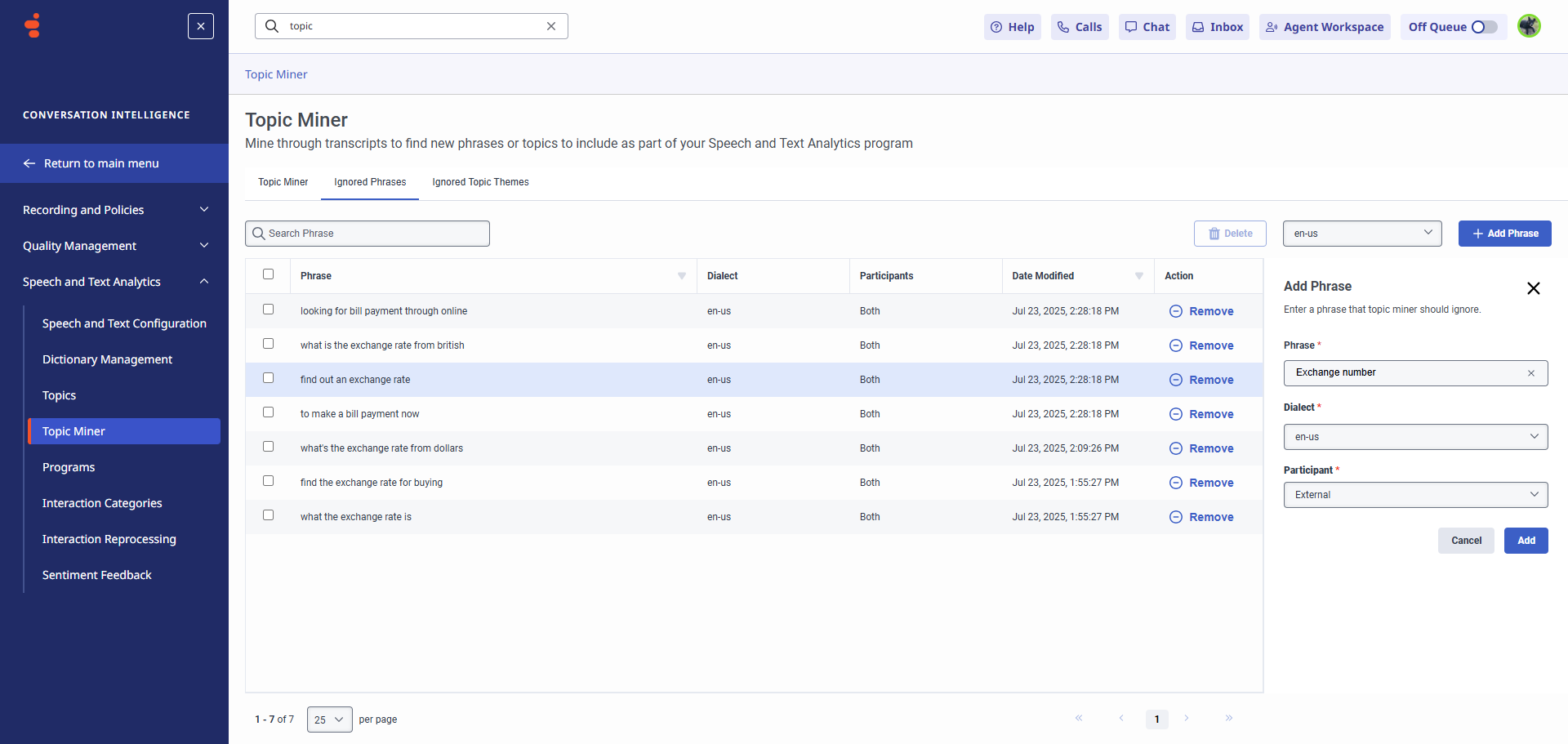 Genesys Cloud는 관련된 모든 구문을 자동으로 구문 무시 목록에 추가합니다. 대화의 상담원, 고객 또는 양측 모두에 대해 무시되는 주제를 관리할 수 있습니다.