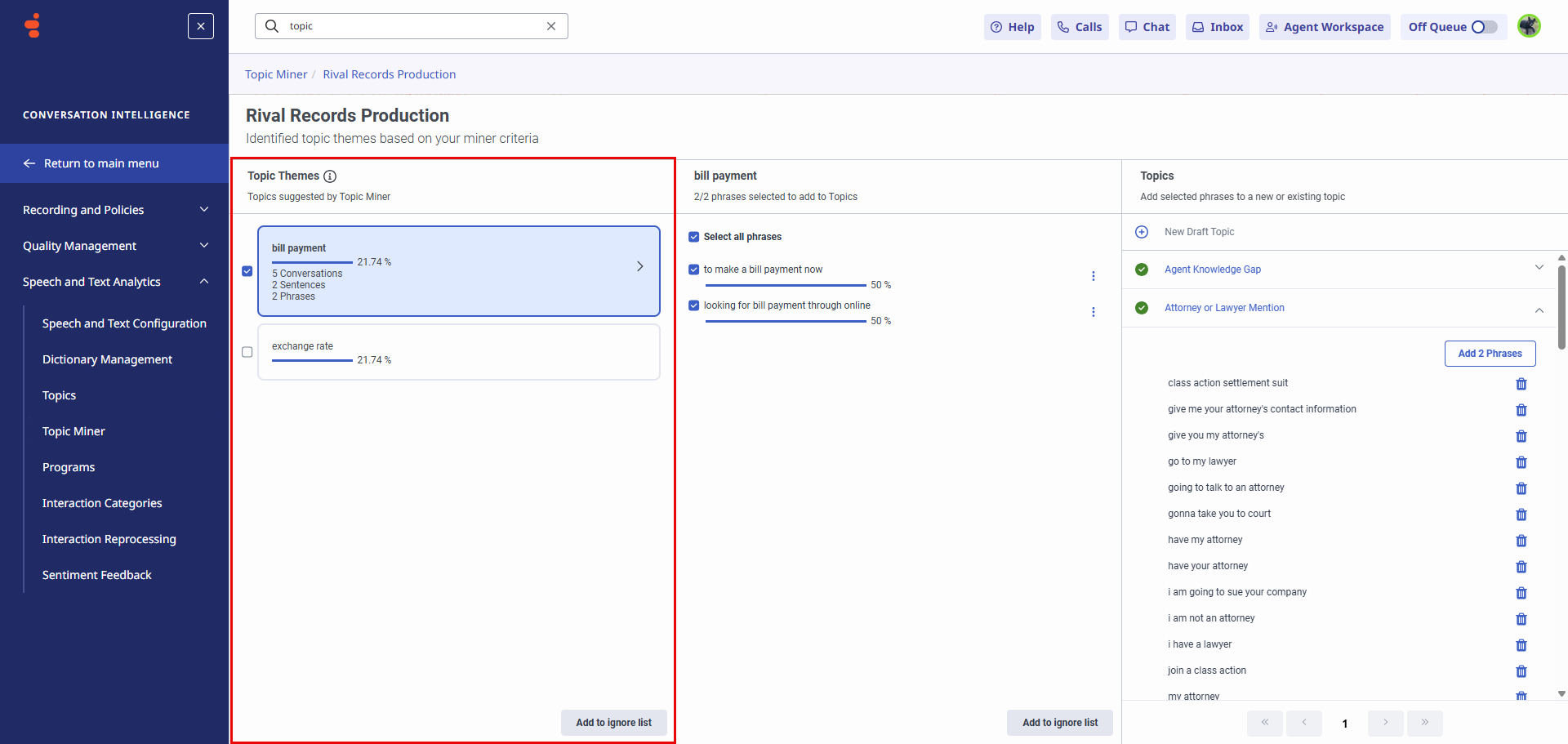 주제 마이너의 반복적이거나 관련성 없는 제안을 피하기 위해 기본 제공되고 사용자 정의가 가능한 무시 목록을 사용합니다. WEM(Workforce Engagement Management)에서 주제 마이너를 사용하면 무시 목록을 사용하여 이미 조치를 취했거나 필요하지 않은 주제와 구문을 제외할 수 있습니다. 이러한 기본 제공 및 사용자 정의 목록을 사용하면 이미 사용 중이거나 원하지 않는 제안을 숨겨 새롭고 관련성 있는 콘텐츠를 표시하는 데 도움이 됩니다.