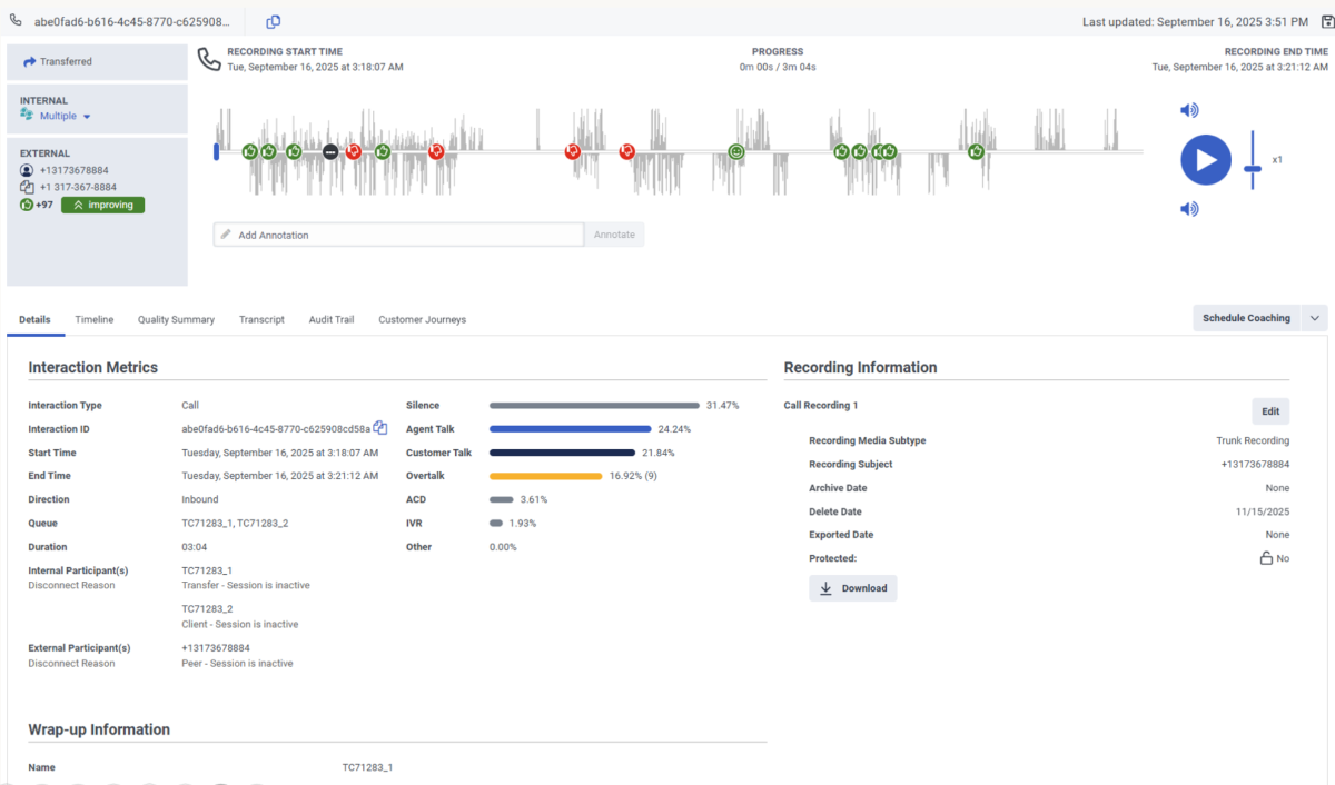 NS 세부 탭은 상호 작용에 대한 정보를 볼 수 있는 중앙 위치를 제공합니다. NS 세부 탭에는 상호 작용 메트릭, 녹음 정보, 요약 정보, 참가자 데이터 및 SIP 진단이 요약되어 있습니다. 자세한 내용은 다음 세부 섹션을 참조하세요.
