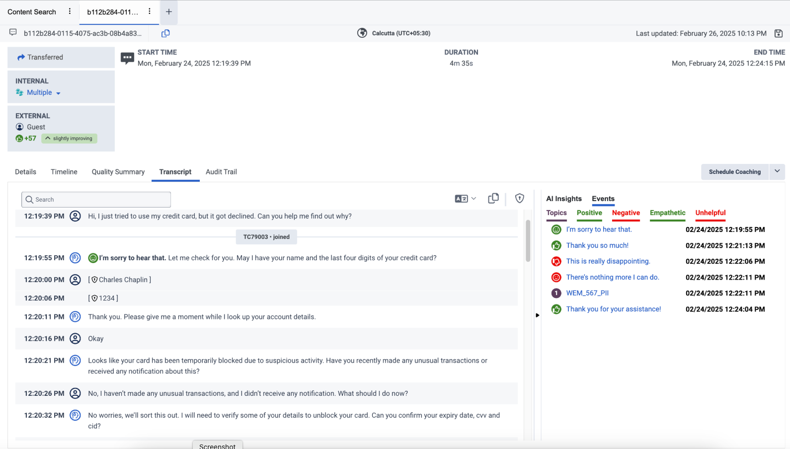 Transcript 탭은 화자에게 고객과 상담원 간에 발생하는 디지털 대화의 분리된 전사를 제공합니다. 기록은 상호 작용에서 일어난 일에 대한 통찰력을 제공하고 비즈니스 문제와 기회 영역을 발견할 수 있도록 합니다.