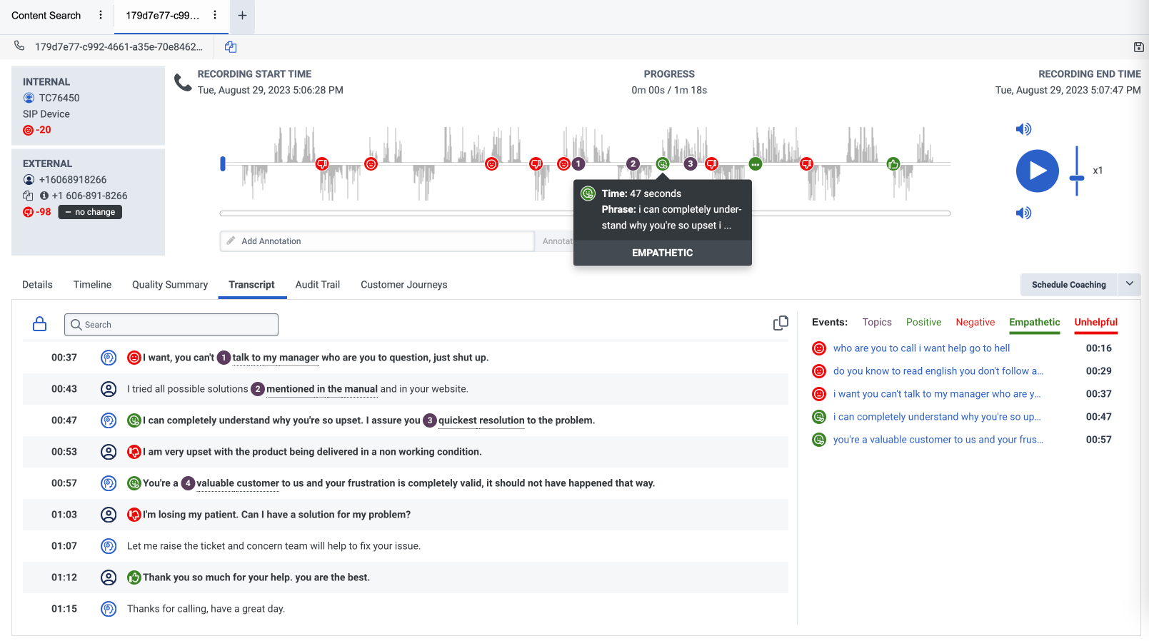 - 공감 마커 – 화면 상단의 파형이나 녹취록에 있는 공감 마커 위로 마우스를 가져가세요. 공감 문구가 포함된 도구 설명이 두 위치 모두에 나타납니다.