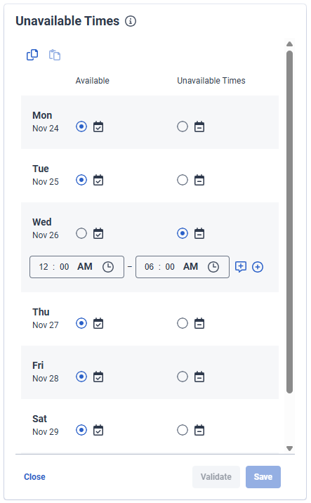 - 다른 날짜에도 필요에 따라 단계를 반복합니다. 사용하다 다른 주에 복사 일주일 동안 입력한 사용 불가능한 시간을 복사하려면 아이콘을 클릭하고 반죽 다른 주에 동일한 이용 불가능한 시간을 적용하려면 아이콘을 클릭하세요. 일주일에 사용할 수 없는 시간을 붙여넣을 때마다 다음을 클릭하십시오. 구하다 일정을 생성하거나 일정을 재조정할 때 사용할 수 없는 시간이 고려되도록 합니다. 메모 : 최소 급여 시간이나 기타 일정 규칙 등 작업 계획 제약 조건을 위반하는 사용할 수 없는 시간 항목을 추가하면 문제를 알리는 경고가 나타납니다. 나중에 필요에 따라 사용할 수 없는 시간을 추가하거나 업데이트할 수 있으며, WFM은 이를 스케줄러 또는 관리자 보기에 최근 저장된 항목으로 저장합니다. 일정을 다시 잡는 동안 스케줄러 또는 관리자는 일정을 다시 생성할 때 원래 저장된 사용 불가능한 시간을 사용할지, 아니면 마지막으로 저장된 사용 불가능한 시간을 사용할지 선택할 수 있습니다. 이용할 수 없는 시간을 재조정하는 방법에 대한 자세한 내용은 이 문서의 이용할 수 없는 시간 재조정 섹션을 참조하세요.