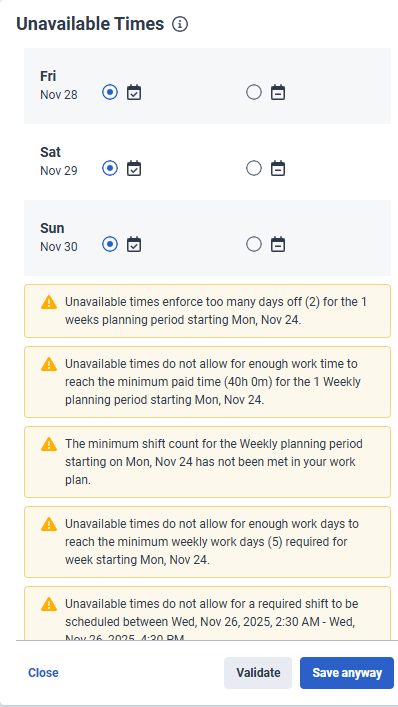 사용할 수 없는 시간을 입력하거나 작업 계획 제약 조건을 위반하면 최소 급여 시간이나 기타 일정 규칙과 같은 경고가 나타납니다. 즉, WFM 스케줄러는 입력한 이용 불가능한 시간을 기준으로 교대 근무를 할당할 수 없습니다. 상담원은 입력한 시간을 수정하거나 요청을 저장할 수 있습니다. 그러면 스케줄러가 수동으로 검토하여 필요한 근무 시간이 충족되는지 조정하고 확인할 수 있습니다. 자세한 내용은 이 문서의 경고 메시지 섹션을 참조하세요.