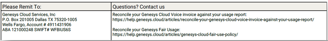 송장 하단에는 Genesys 공정 사용 정책과 Genesys Cloud 청구 리소스에 대한 링크가 포함되어 있습니다. 이 문서에서는 허용량과 초과 요금이 어떻게 계산되는지 자세히 설명하므로 언제든지 요금을 확인할 수 있습니다.