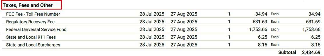 세금, 수수료 및 기타 섹션에는 Genesys가 아닌 정부 기관에서 요구하는 요금이 표시됩니다. 이러한 요금에는 다음이 포함될 수 있습니다.