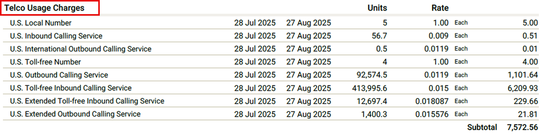 리소스 사용량과 달리 통신사 요금은 항상 사용량을 기준으로 하며 사용자의 활동에 따라 매달 표시됩니다. 통신 요금에 대한 자세한 내용은 다음을 참조하세요. Genesys Cloud Voice 송장을 사용 보고서와 대조하세요. .